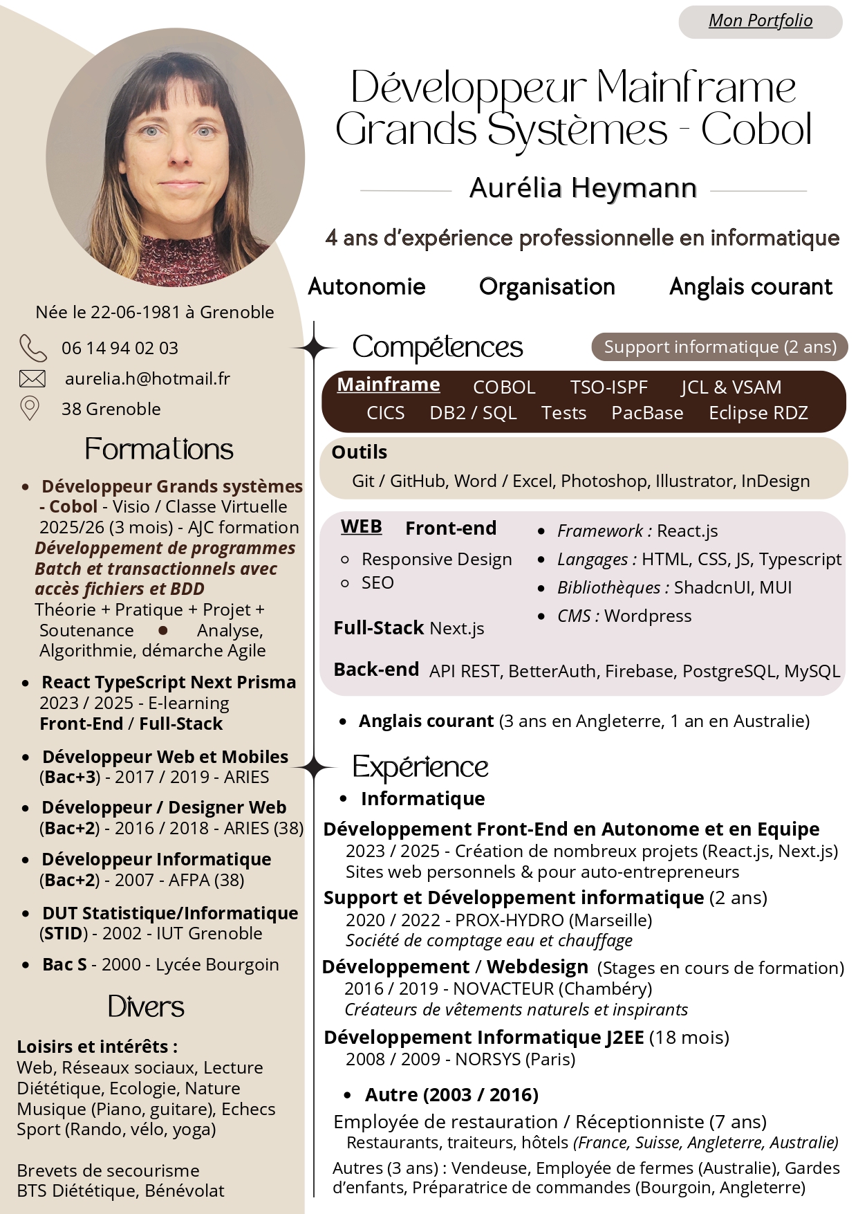 Je termine (mars 2026) une formation Mainframe / Cobol avec AJC formation, une expérience que j’ai particulièrement appréciée et qui m’a donné une réelle envie de poursuivre ma carrière dans ce domaine.